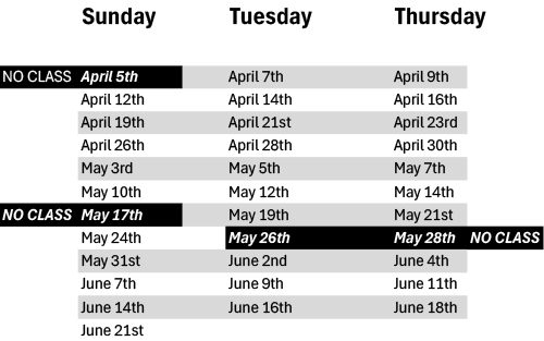 This semester offers a 10-Week Program on Sunday mornings, Tuesday and Thursday evenings for participants aged 10 to 19.